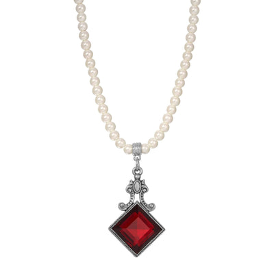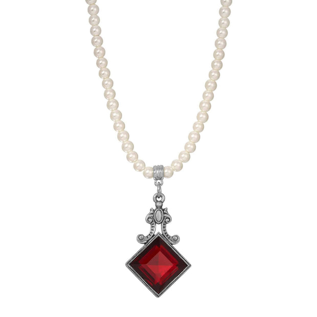 An antiqued inspired necklace featuring a square Siam red glass stone on a scroll pewter pendant that dangles from a 4mm white faux pearl strand necklace. This necklace also comes with a 3-inch extender with lobster clasp.