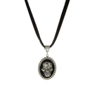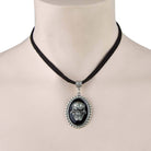 This striking oval pendant features bold black enameling and a gothic skull at its center, creating a dramatic statement piece. Hanging from a 9.5" black suede necklace with a 3-inch extension chain, it combines edgy style with versatility. A lobster clasp closure ensures a secure and comfortable fit, perfect for adding a dark, gothic touch to any look.