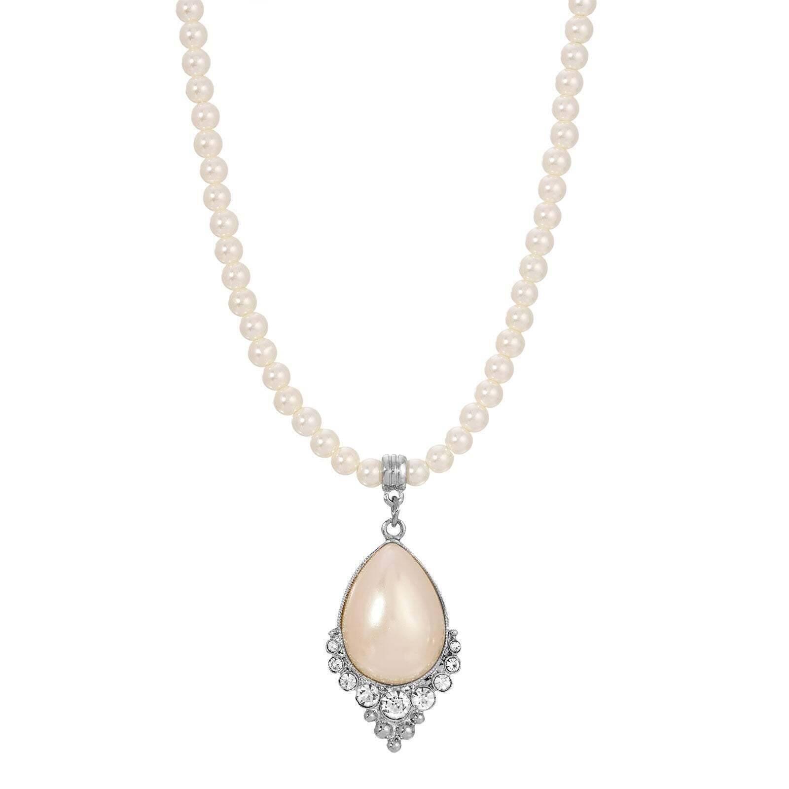 1928 Jewelry Teardrop Faux Pearl Crystal Accent 4mm Pearl Strand Pendant Necklace 16"