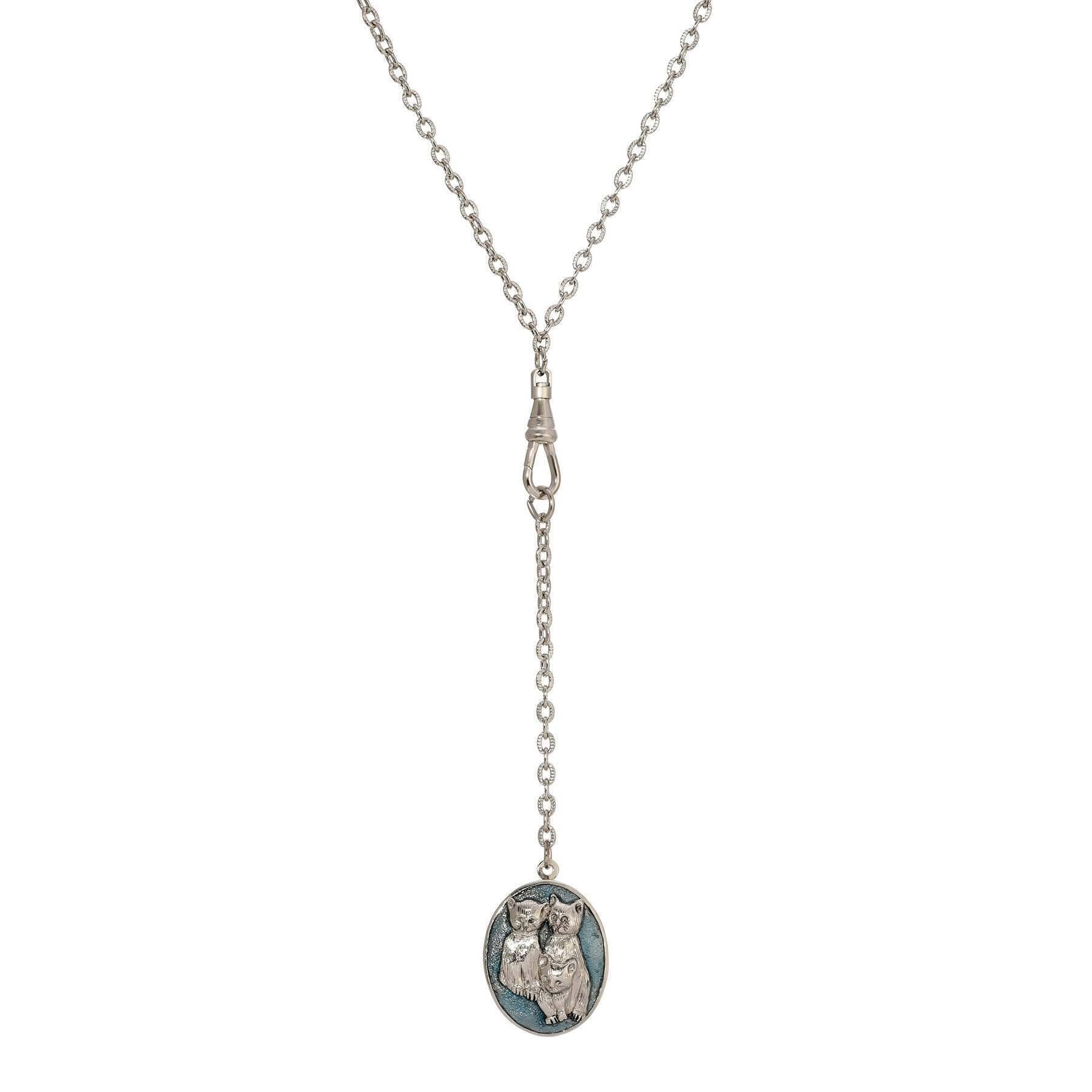 1928 Jewelry Three Little Kittens Sapphire Blue Enamel Pendant Locket Y-Necklace 26"