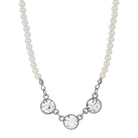 Indulge in the delicate allure of this luminous 4mm round white glass faux pearl strand necklace, gracefully adorned with three captivating round brilliant crystals that shimmer with ethereal radiance. Designed to evoke elegance and sophistication, the necklace is accompanied by a 3-inch extension chain, complete with a lobster clasp closure, ensuring a seamless and secure fit for any occasion. Embrace the subtle opulence of this piece, exuding a timeless charm that effortlessly elevates your ensemble with understated glamour.