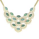 This gold-tone filigree bib necklace showcases a captivating arrangement of navette-shaped turquoise stones, set within intricate metalwork for a striking statement. The 3-inch extension chain allows for a customized fit, while the lobster clasp closure ensures secure wear. Perfect for adding a bold yet elegant touch to any ensemble.