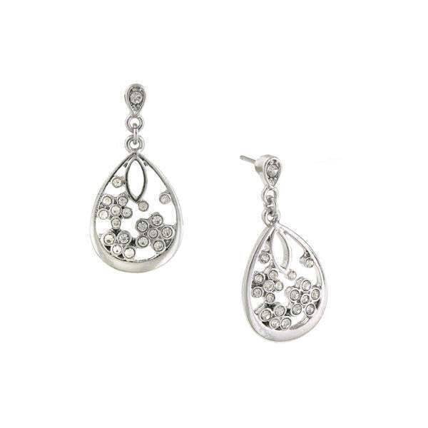 Featuring a set of silver toned teardrop earrings accented with crystal studded flowers. Small crystals add a touch of sparkle at the posts to complete the look.