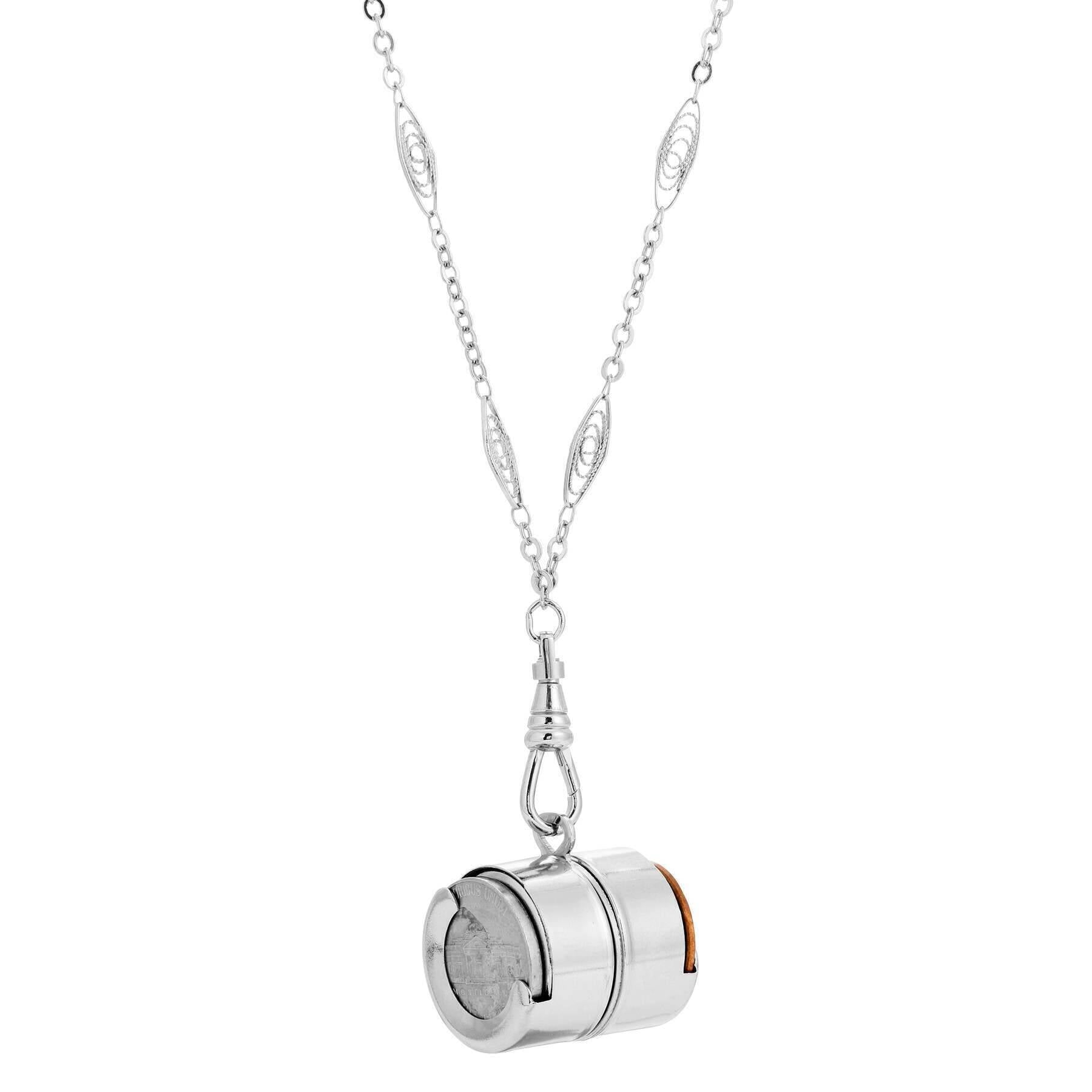 Take a trip down memory lane with this vintage nickel coin holder dispenser pendant! This classic necklace features a spring loaded aluminum coin holder that holds up to 4 nickels! The dispenser hangs from a swivel that hangs from a oval filigree link and cable chain necklace with lobster clasp.