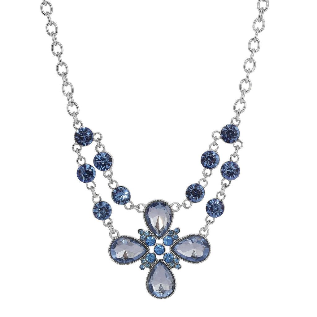 This gorgeous necklace features pear-shaped sparkling crystals in a flower design. Along the silver-tone chains are glistening light amethyst or Light Blue color crystals creating a fabulous piece with plenty of sparkle and shine.