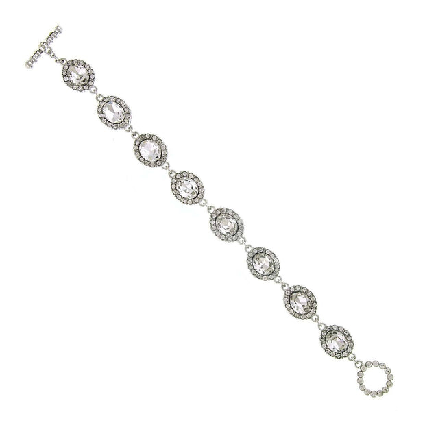 Tiny clear crystals surround oval faceted clear glass stones that radiate with beauty on a silver tone link toggle bracelet. Add the perfect amount of elegant touch to your look with this masterpiece.