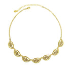 An elegant arrangement of metallic gold-toned leaves are embellished with topaz-colored crystal centers. This lovely and leafy creation is suspended from a delicate gold-toned chain and snuggly secures with a lobster clasp.