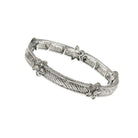 Shimmering crystals and silver tones! Silver tone hatching plays against sparkling diamond lilies for a touch of glamour and sophistication in our dainty stretch bracelet.