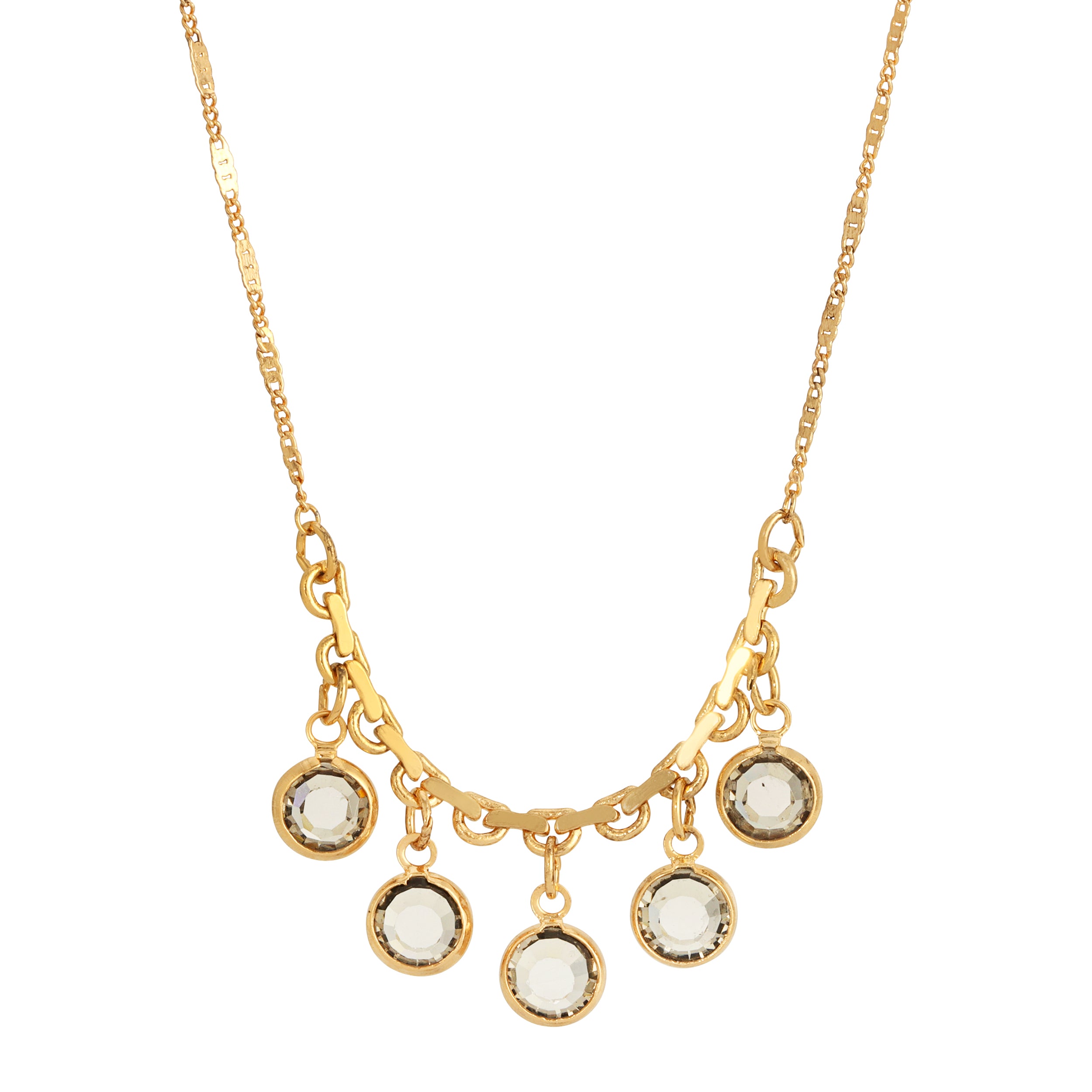 Transform your outfit in an instant with this beautifully made Five Channel fancy necklace. Featuring round Austrian crystals on a 14k gold dipped chain with 3 inch extension.
