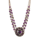 This necklace features three delicate copper tone chains, each embellished with varying shades of amethyst purple beads and intricate metalwork. A striking floral inspired pendant, centered with a deep amethyst purple jewel and surrounded by smaller purple accents, serves as the focal point. This piece adds a touch of vintage-inspired charm to any ensemble.
