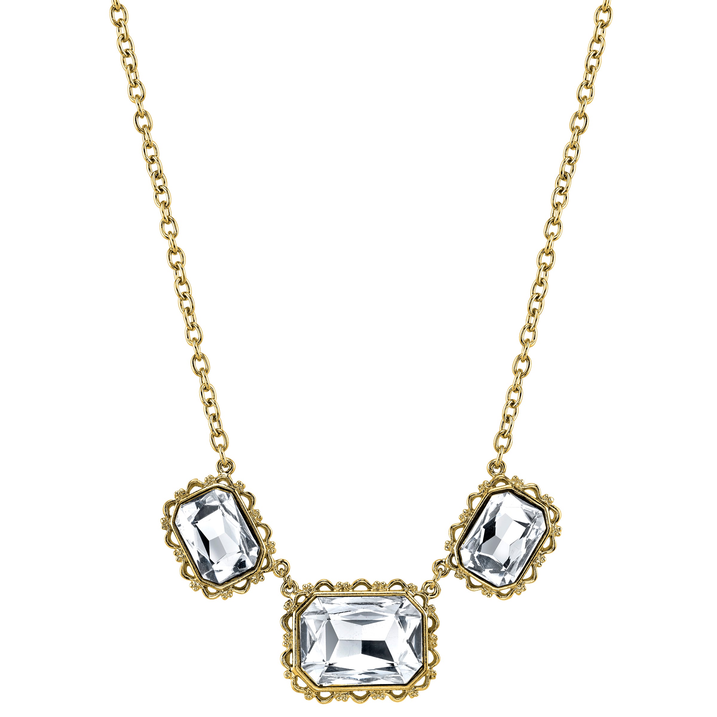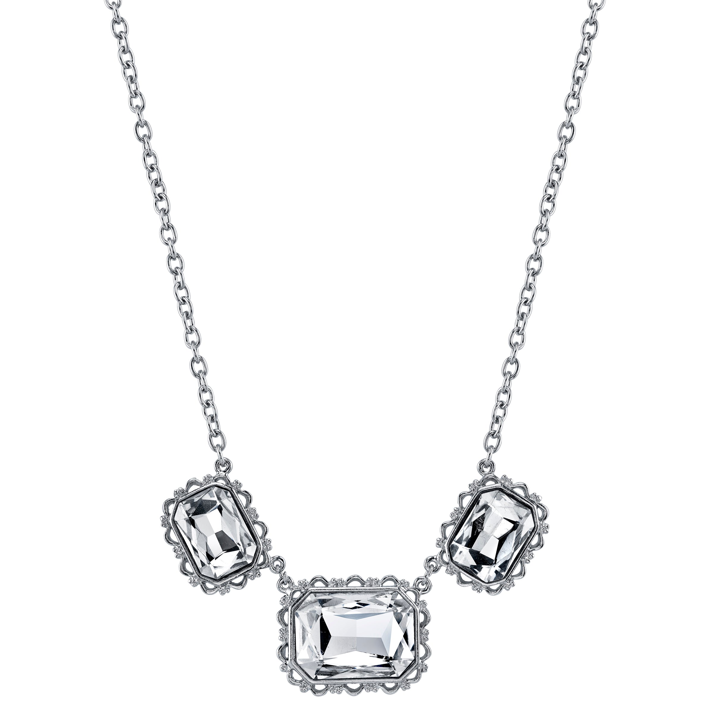 A trio of large faceted octagon crystals sparkle and shine in silver-toned or gold tone filigree settings. These gorgeous crystals accentuate a 16" chain creating a dramatic look.