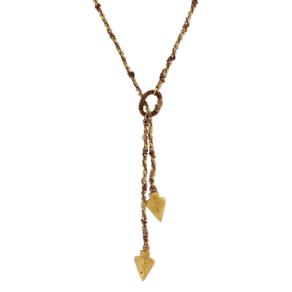 Vintage style Native American inspired jewelry and Bohemian chic at its best! Versatile double arrowhead brass tone lariat necklace is hand wrapped with walnut brown wax linen. This 42" long piece can be worn as a necklace, bracelet or loosely as a belt! This Lariat pendant necklace is a favorite amongst the boho chic, artistic, spiritual like-minded fashionistas. Let your free spirit fly with this brass tone T.R.U. pendant. A style that adds vintage elegance to any leisure day outfit can also be worn for your formal special events. It's a perfect way to express your creativity and it's a great addition to accessorize your wardrobe. It will inspire you to immerse yourself in subtle adventure. It makes an ideal and affordable gift for her.