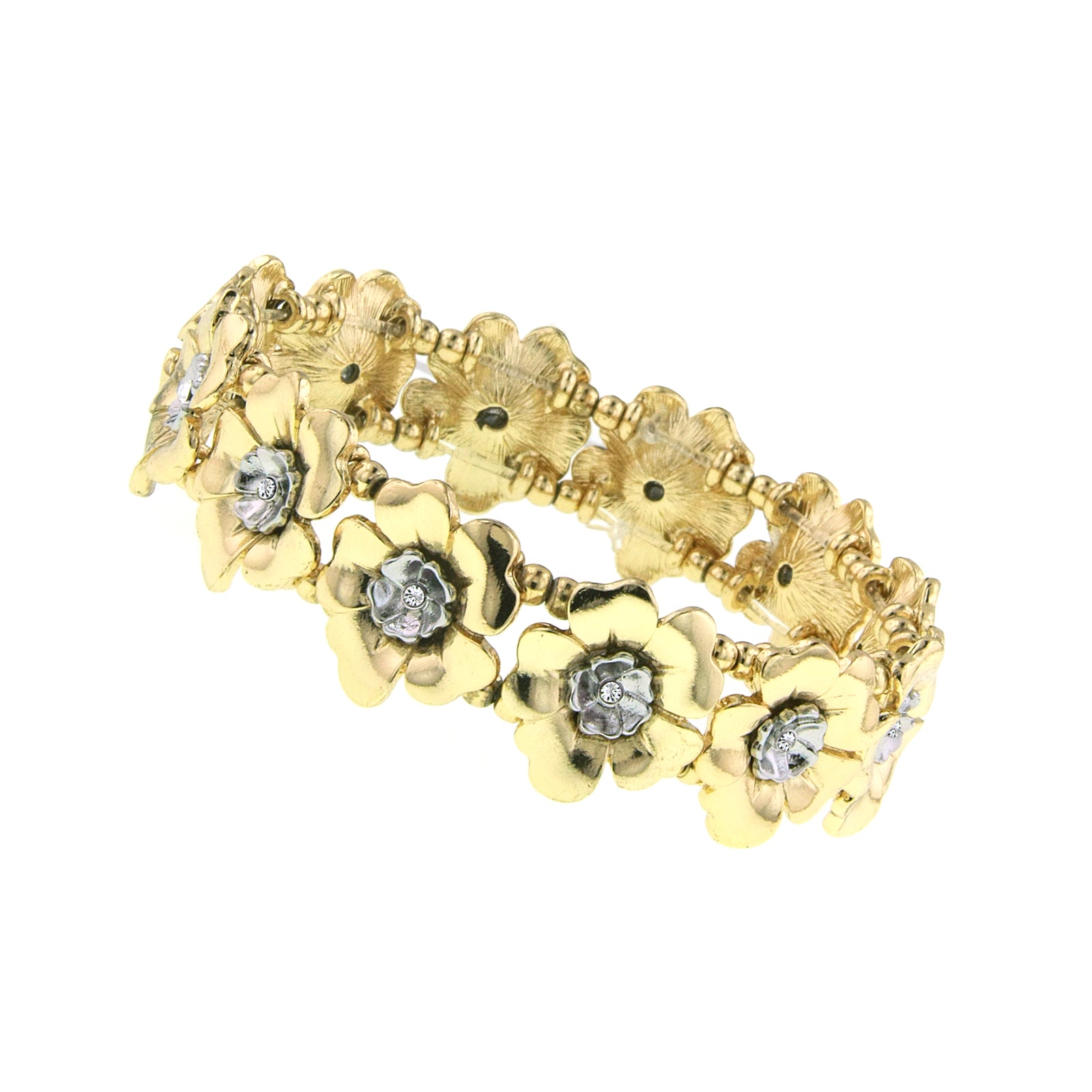 This gold-tone stretch bracelet is dainty and delicate and sure to be a favorite! At the center of the silver-tone flowers is a small gold-tone flower with a crystal in the center.