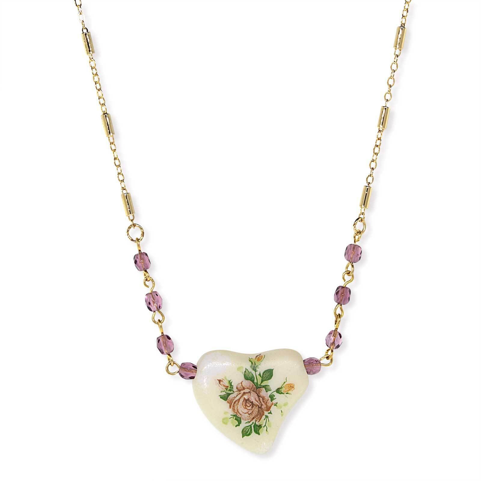 1928 Jewelry Purple Beaded White Heart With Pink Floral Decal Necklace 16" + 3" Extender