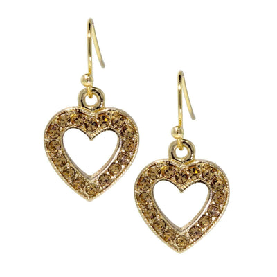Unique and charming, these vintage inspired heart gold tone drop earrings are full of lustrous champagne crystals.