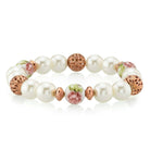 The 12mm faux pearls are accented with rose gold tone filigree beads in the same size. Interspersed throughout are three lovely faux porcelain beads each containing a delicate floral motif.