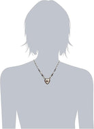 One of our favorite necklaces in the Manor House collection, this vintage Victorian necklace features alternating faux pearls and amethyst color purple crystals. The highlight of this necklace is the heart shaped filigree pendant inlaid with a vintage floral motif.