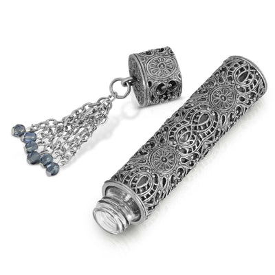 A romantic keepsake for the heart and soul, this antique-style pewter vial holds 7.393ml and is wrapped in intricate filigree with a soft silver colored patina. The screw-top cap features delicate chain tassels tipped with Montana blue Czech glass beads, swaying like whispered secrets. Whether for perfume, oil, ashes, or colored sand, it slips effortlessly into a pocket or bag, carrying precious memories wherever you go.