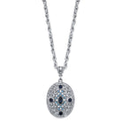 An exquisite pendant necklace with a glamorous, vintage feel. Featuring an oval filigree pendant in a bright silver tone adorned with light blue Czech crystals and blue glass stones.