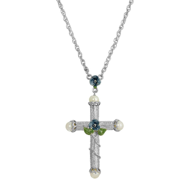 Symbols Of Faith Blue Rose Enamel Cross Faux Pearl Pendant Necklace 30"