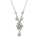 A delicate style full of dazzle and shine. This gorgeous silver tone necklace features a cluster of sparkling crystals in a floral design with a dangling flower accent. Along the silver toned chain are glistening crystal flower accents creating a breathtaking effect.