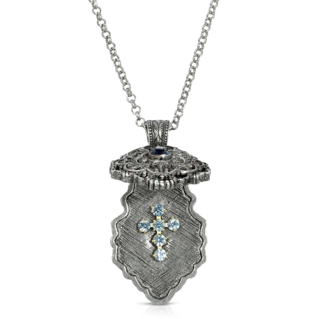 Symbols Of Faith Antiqued Pewter Blue Crystal Cross Locket Necklace 28"