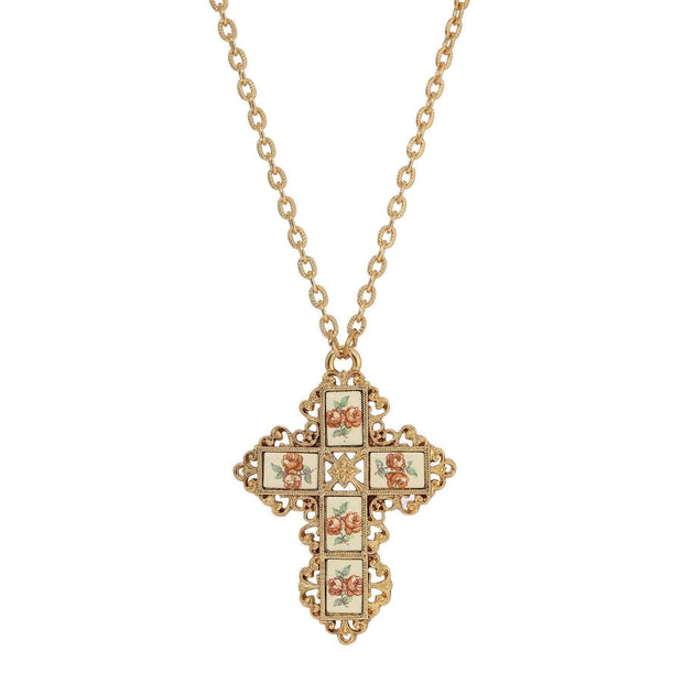 This timeless filigree cross pendant features five enamel floral stones and is dipped in 14k gold for an elegant touch. The pendant cross dangles from an oval linking chain with lobster clasp.