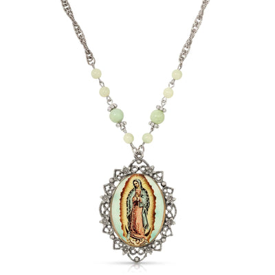 Symbols Of Faith Green Bead Floral Filigree Our Lady Of Guadalupe Pendant Necklace 28"