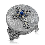 Keep a memory alive in this intricately detailed silver-toned box toped by a blue-accented jewel encrusted cross. Rests on a trio of ornately carved silver-toned legs.