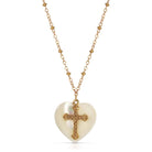 A uniquely designed pendant necklace featuring a heart shaped mother of pearl cabochon stone with a cross at the center. The small ball cable chain comes with a 3-inch extender.