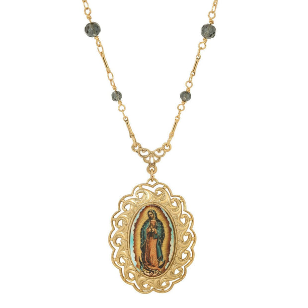 A fine, ornately crafted pendant necklace made with many elegant details. Featuring a radiant wave & swirling pendant with an oval decal of Our Lady Of Guadalupe, which dangles from a chain with with station bars and Montana blue glass beads. This necklace comes with a lobster clasp closure.