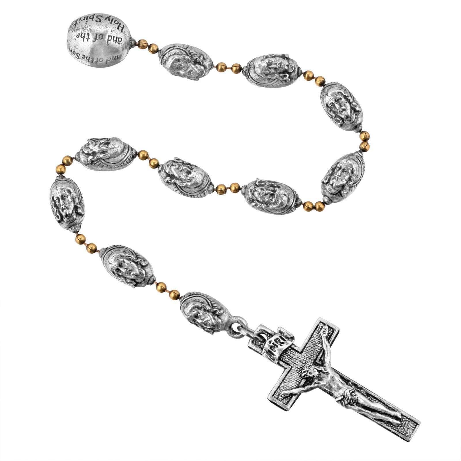 A uniquely designed Rosary for our Symbols Of Faith line, this rosary features a pewter crucifix attached to 10 elongated pewter accents with the image of Jesus. In between each, two 2mm gold tone balls. On the opposite end of the crucifix is the Our Father Creed.
