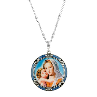 Symbols Of Faith Round Blue Enamel Madonna and Child Decal Pendant Necklace 30"