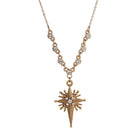 This necklace captures the essence of faith and inner radiance, making it suitable for various occasions.Our vintage-inspired Radiant Cross Pendant Necklace features a beautifully crafted cross cross against a backdrop of radiant starburst style setting. It hangs delicately from a linking chain adorned with round European crystals, infusing a modern touch.