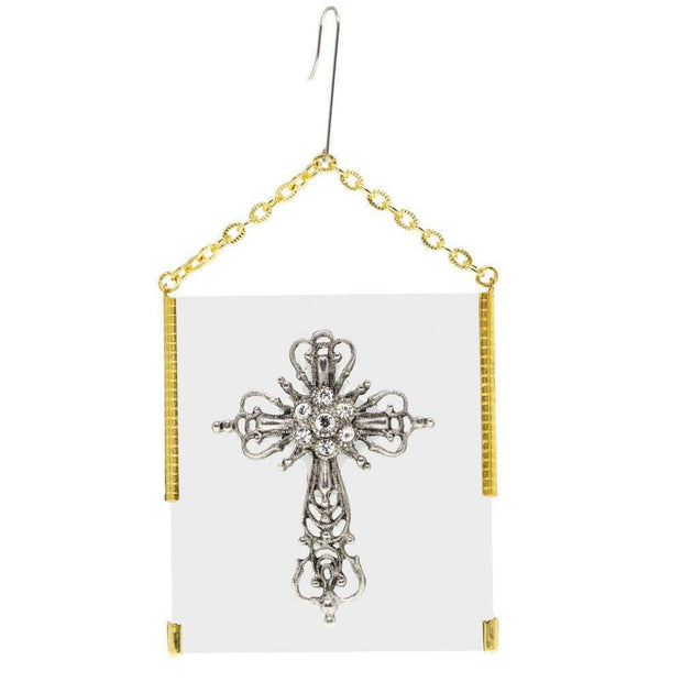 Remember the reason for this season with this beautifully made vintage style glass cross hanging ornament with crystals. This filigree silver cross ornament features a stunning gold tone frame & chain and includes 7 brilliant crystals. This glass cross Christmas ornament makes a great gift for the Holiday season and is proudly made in the United States.