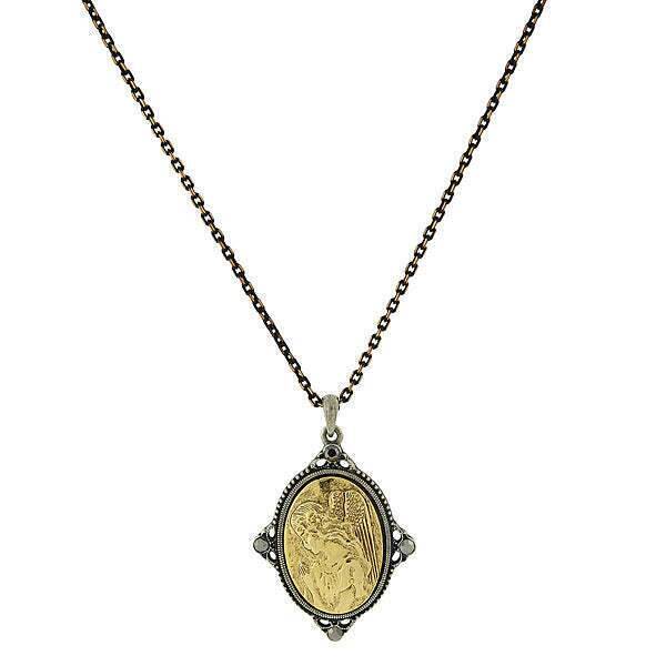 This beautiful mixed metal necklace depicts an image of a guardian angel in 14k gold-dipped metal surrounded by an antiqued frame embellished with hematite-color stone accents.