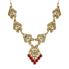 This vintage inspired necklace with a matte finish, gold antiqued plating and chandelier drop statement screams tribal with a modern twist. Fine details of swirls connect within each chevron and multifaceted red carnelian beads dangle from the center pendant. It will add an adventurous, natural flow to your lifestyle. Its a perfect way to express your creativity and its a great addition to accessorize your wardrobe. It will inspire you to immerse yourself in subtle adventure. Our handcrafted necklace makes a perfect affordable gift and its a favorite amongst the sunny-optimists, adventure-seekers, boho chic like-minded fashionistas.