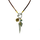 This boho-inspired necklace features a brown raw cowhide cord accented with a mix of semi-precious beads including green malachite and white howlite. A pewter toggle loop connects unique charms such as a gold-dipped flower, silver tusk, and silver arrowhead, adding natural and rustic character. Finished with a lobster clasp, this piece combines organic textures with metallic highlights for a grounded, earthy vibe.